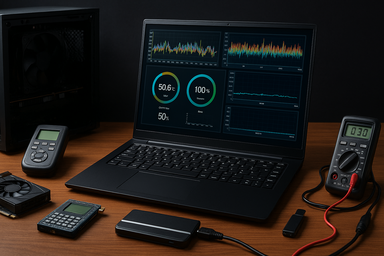 • عیب‌یابی نویز: گوش‌دادن به نویز فن یا Coil Whine با ابزارهای رکورد صدا.